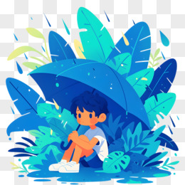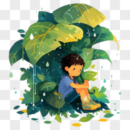 春天植物下避雨的小男孩元素
