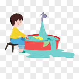 卡通手绘免抠小男孩开着水龙头洗衣服免抠元素