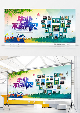色彩简约毕业季照片墙毕业不说再见宣传展板设计