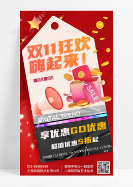 活动促销红色双十一购物狂欢简约C4D手机海报手机宣传海报