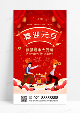 红色c4d元素卡通元旦快乐超市元旦手机文案海报