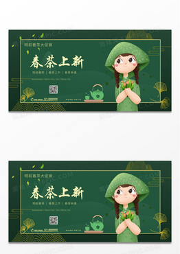 绿色简约插画春天姑娘采茶展板春茶茶叶