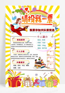 大队委员竞选彩色放射光线卡通活泼请投我一票大队长海报