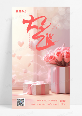 粉色七夕礼盒玫瑰花七夕情人节手机宣传海报