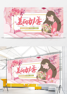 38妇女节展板淡粉色简约海报插画