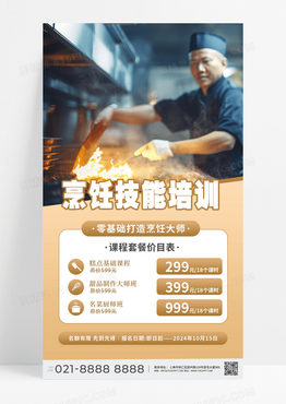 浅黄色简约烹饪技能甜品培训厨师培训炒菜营销宣传海报
