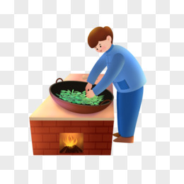 手绘男子灶台炒茶素材