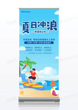 蓝色创意夏日旅行夏天插画游泳冲浪度假易拉宝