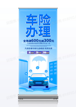 简约蓝色卡通车险办理促销车辆保险展架易拉宝