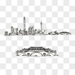 手绘线稿四川成都廊桥免抠元素