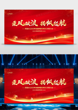 2023红色大气年会乘风破浪扬帆起航企业年会舞台背景展板