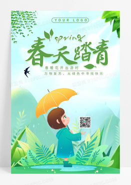 绿色春天雨季撑伞踏青卡通女孩宣传海报