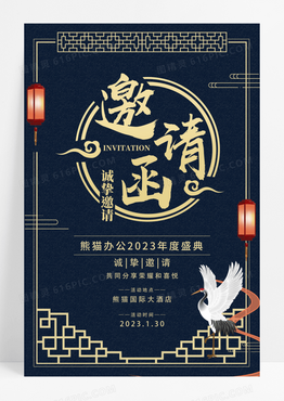蓝色国潮风邀请函邀请海报竖版邀请卡公司邀请函