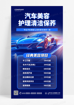 蓝色背景汽车美容汽车贴膜汽车维修价目表跑车手绘炫彩手机海报