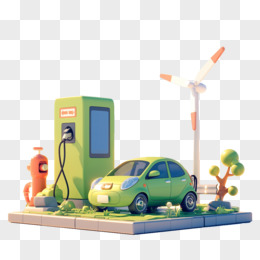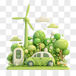 3D卡通新能源绿色小车和风车充电桩免抠元素