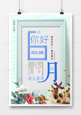 简约扁平蓝色创意相框画框小清新风格可爱六月你好商务宣传海报