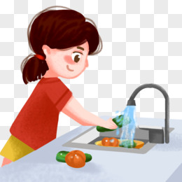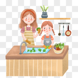 手绘卡通妈妈教小女孩洗菜插画免抠元素