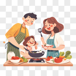 卡通手绘一家人在厨房做饭元素