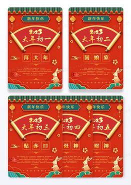 红色烫金剪纸风兔年春节大年初一到初五组图海报