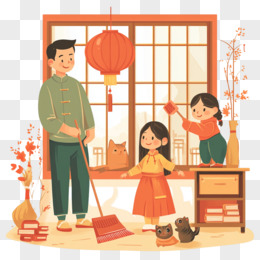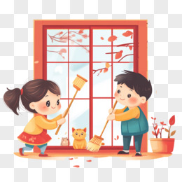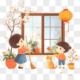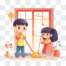 手绘男孩女孩张灯结彩打扫卫生免抠元素