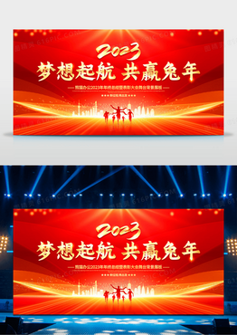 2023梦想起航共赢兔年兔年红色大气春节企业年会舞台背景展板