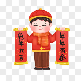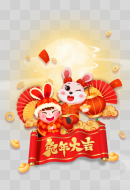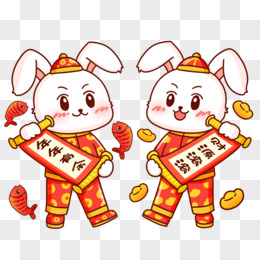 卡通手绘可爱新春一对兔子拿对联表情包元素