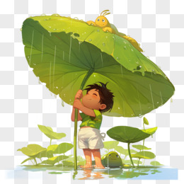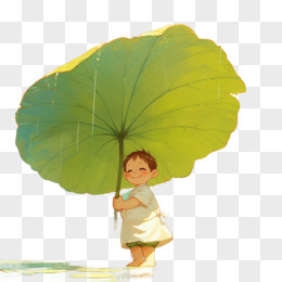 扁平风格小孩在荷叶下躲雨的免抠元素