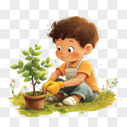 卡通风格春天户外种植植物的可爱男孩免抠元素