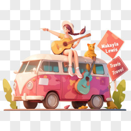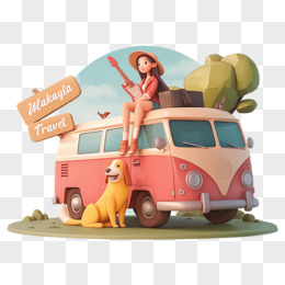 3D春天女孩坐大巴出游免抠元素