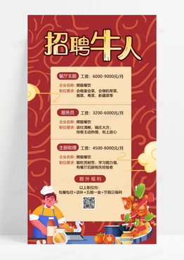 大气红色国潮中国风招聘牛人厨师餐厅招聘海报