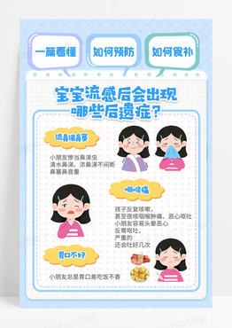 浅蓝黄色卡通插画儿童流感宝宝流感出现的后遗症预防宣传海报