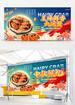 蓝色红绸国潮风2025金秋蟹礼国庆中秋大闸蟹活动促销展板