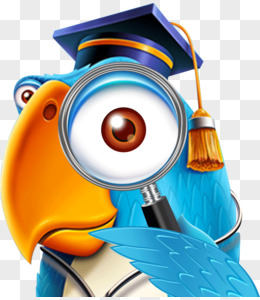卡通手绘戴博士帽的蓝色小鸟放大镜