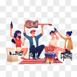 手绘男女篝火晚会弹唱免抠素材