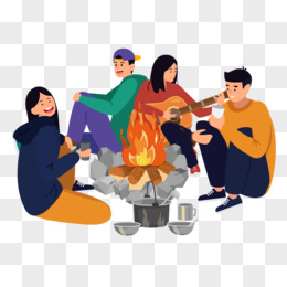 卡通手绘年轻人户外篝火弹唱玩耍免抠