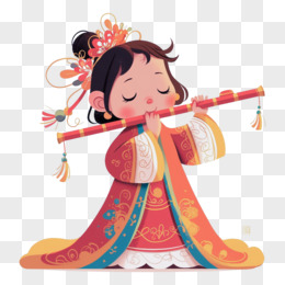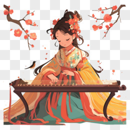 插画风古装女子演的乐器元素