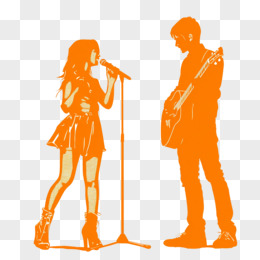 橙色剪影一个女孩在唱歌一个男孩在弹吉他免抠元素