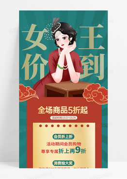 复古国潮插画风女王价到手机长图38妇女节三八妇女节