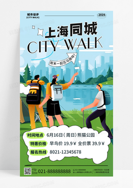 蓝色插画上海同城city walk城市徒步手机宣传海报