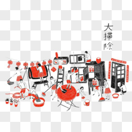 手绘卡通年廿八擦窗户贴窗花搞卫生插画免抠元素