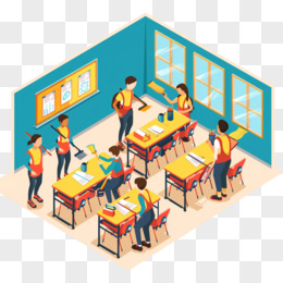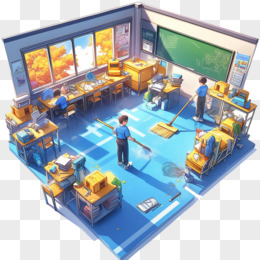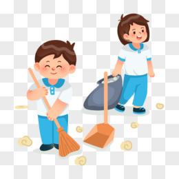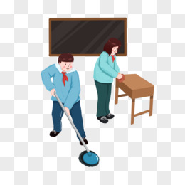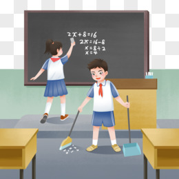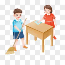 手绘卡通学生在打扫课桌和扫地插画免抠元素