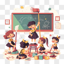 手绘学生打扫卫生摆乐队Pose免抠元素