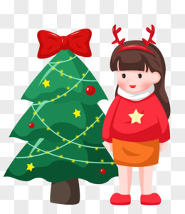 圣诞节之手绘卡通圣诞树和带鹿角头饰的女孩