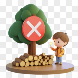 3D插画禁止标志旁一个男孩拿着火苗靠近大树下的木堆免抠元素