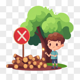 剪影禁止标志旁一个男孩拿着火苗靠近大树下的木堆免抠元素