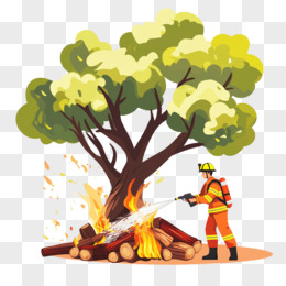 插画消防员用水枪扑灭大树前木堆的火免抠元素