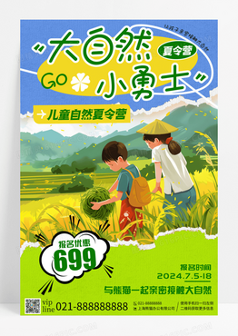 蓝色撕纸插画大自然小勇士自然夏令营宣传海报