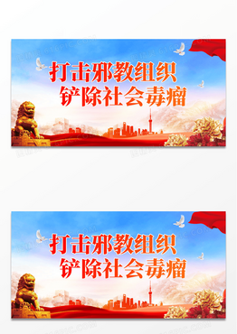 大气时尚红蓝色剪影党建城市灯光花朵白鸽狮子打击邪教组织铲除社反邪教展板
