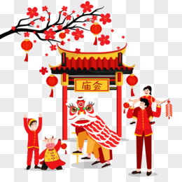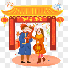 手绘卡通新年母女一起逛庙会插画免抠元素