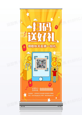 黄色卡通插画负格扫码送好礼促销宣传易拉宝